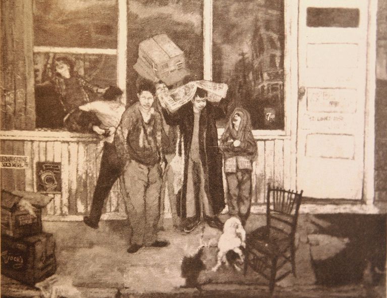 The three little boys there. Two of them are dressed in ordinary everyday clothes. But the third little boy with the Sunday newspapers is dressed partly for Easter Sunday too. And the lady walking around the corner on Ridge, with a pot of flowers; also, part of the Easter Sunday scene."