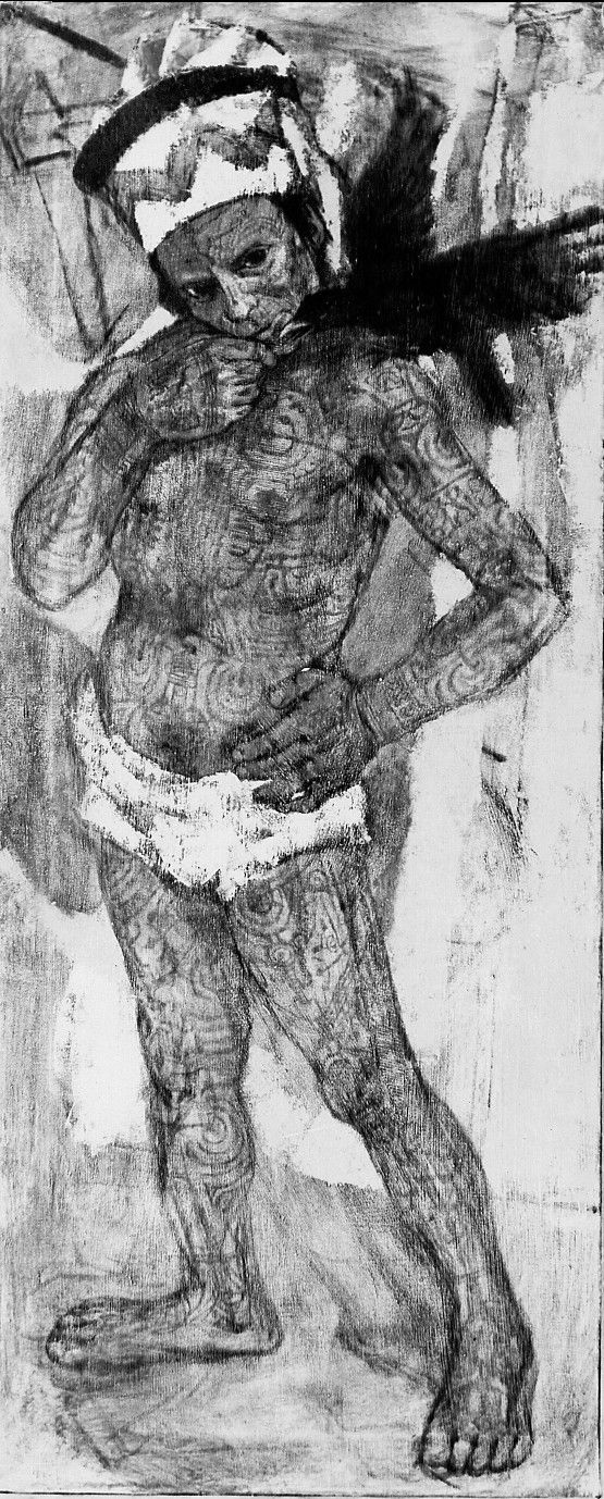This is a South Pacific native. The tattoos on this man's body are identifications of his answers. These particular designs that were tattooed on the body may be family identifications that came down through generations. And a certain design meant a certain relationship to a family.