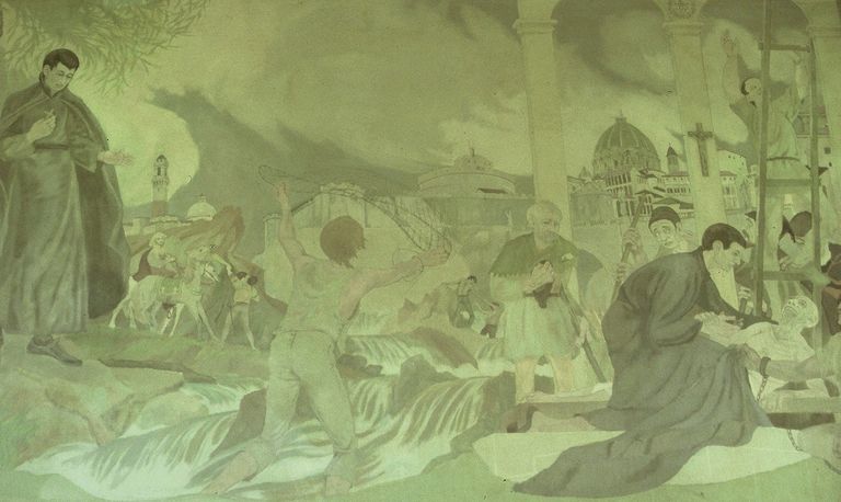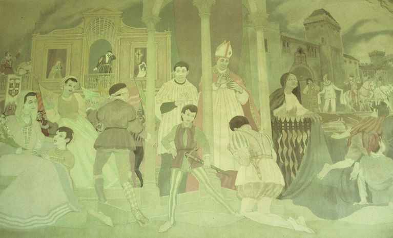 Bernard Riley grew up in the times of the WPA murals but was never able to obtain a commission. However, he did love the large works and offered Fairfield University, a Jesuit college in Connecticut a mural on the life of the young Jesuit Saint Aloysius Gonzaga. He spend months researching and more months painting the mural in Gonzaga Hall. It remains there today