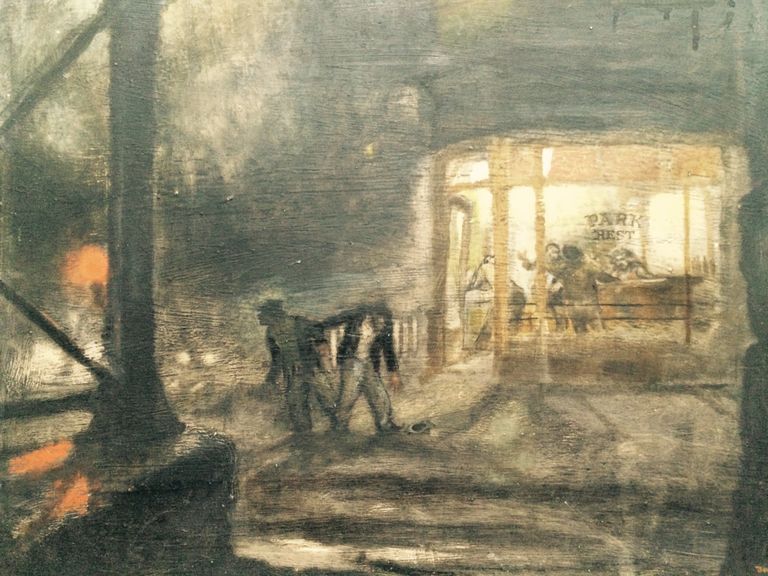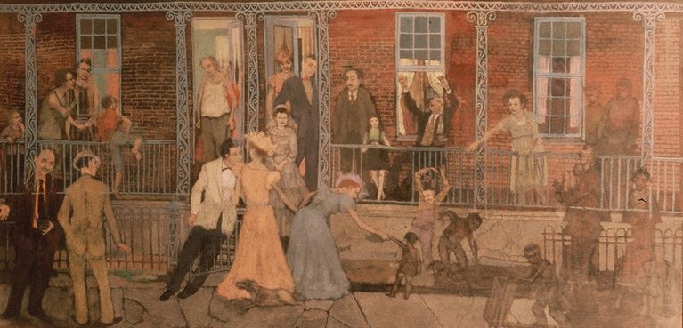 This painting is part of my environment, part of the things that surrounded me. This was the corner of Johnson St. and Ridge Ave, a corner I knew well. In this case, I painted from memory. I suddenly envisioned this little figure of a girl. She looked like a little blossom with her little pink coat and white gloves on this rather grim and shabby rundown corner.