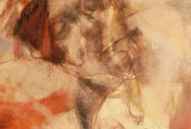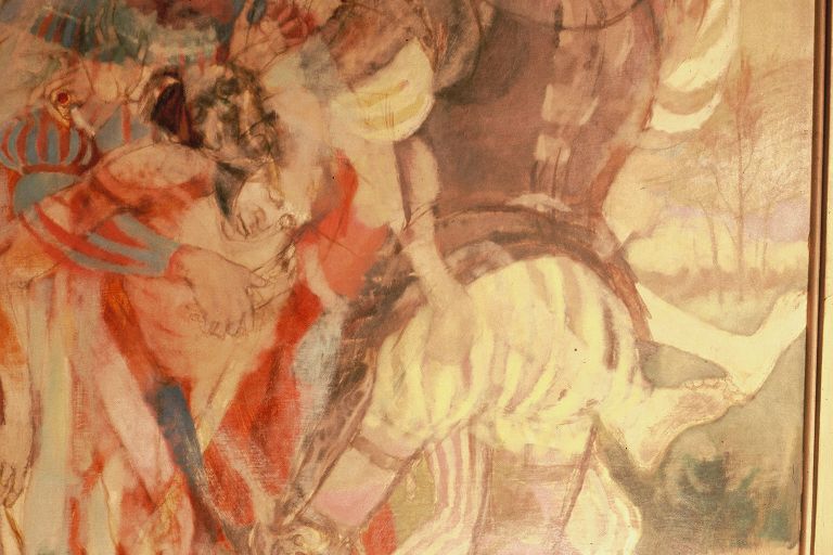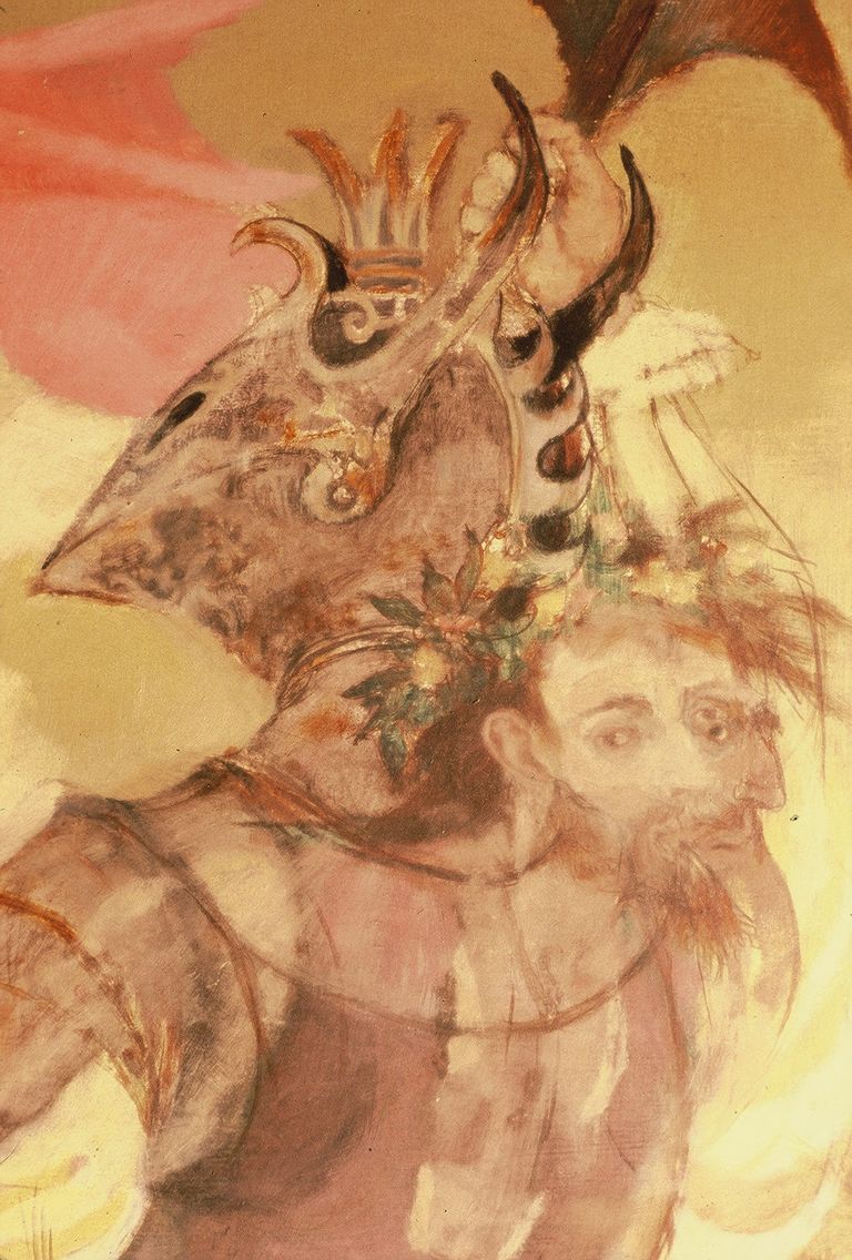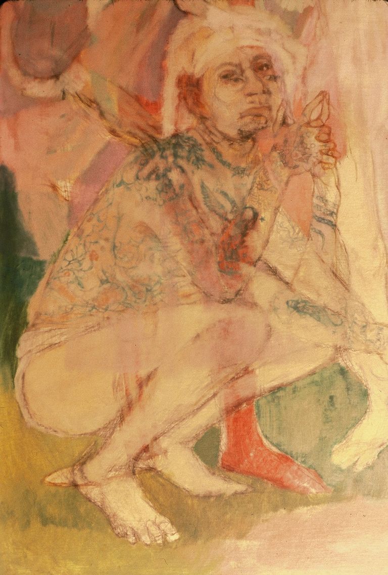 Hands were the things that interested me about the change. Put it that the restlessness of this particular figure. He's the only one in in in the beginning in this panel. And it had some kind of thing in his hand in the first few brush marks. And then these brush marks looked like a bird. And so a bird evolved out of. These few quick brush marks.