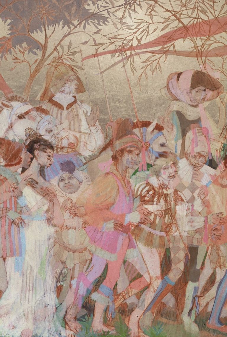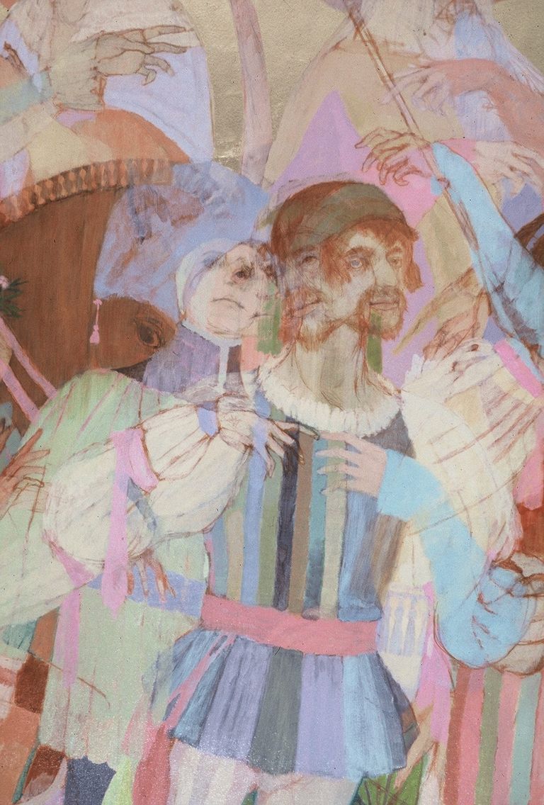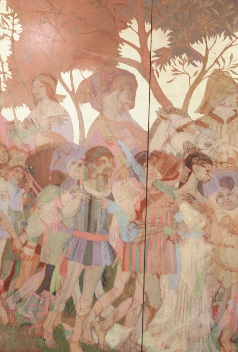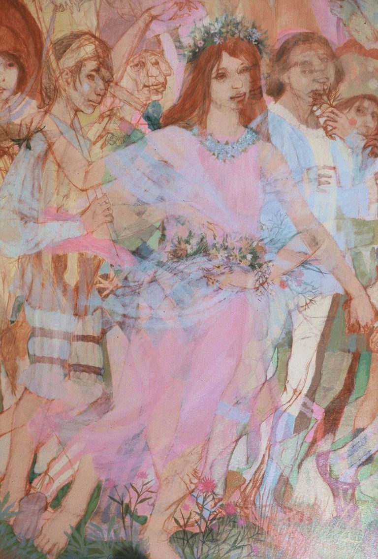 The figures moving across that space seem to have to be. This this was done strictly without planning and without sketches, but done directly on the board, completed in a hurry in order to get into a one man show that I had in the Hilton Hotel. Just as a pure drawing and then I began to work on it and develop it as a painting.