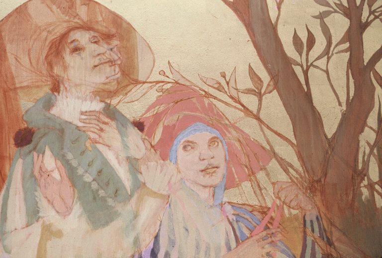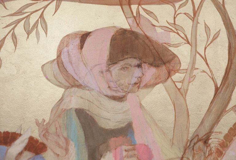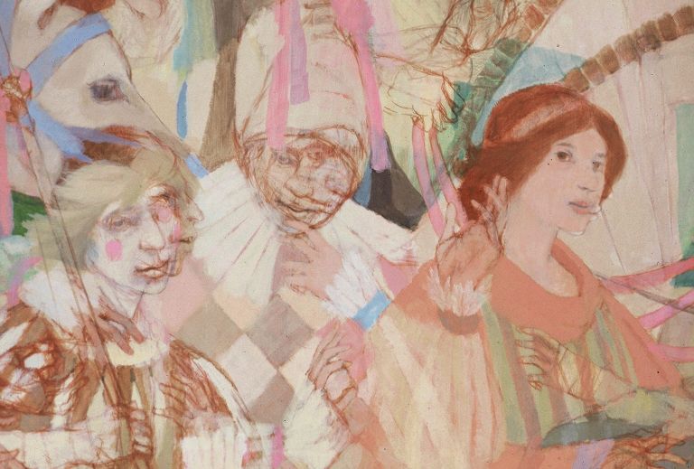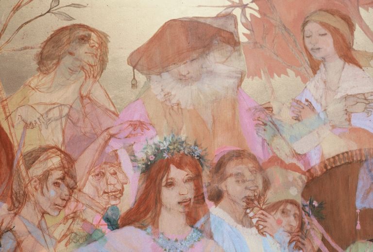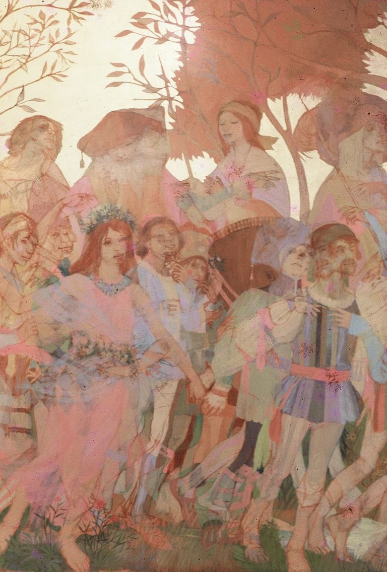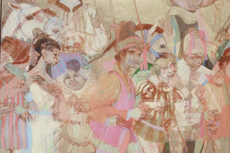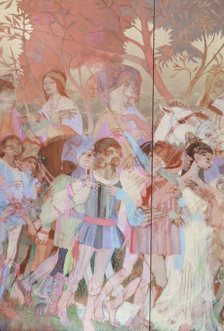 The figures moving across that space seem to have to be. This this was done strictly without planning and without sketches, but done directly on the board, completed in a hurry in order to get into a one man show that I had in the Hilton Hotel. Just as a pure drawing and then I began to work on it and develop it as a painting.