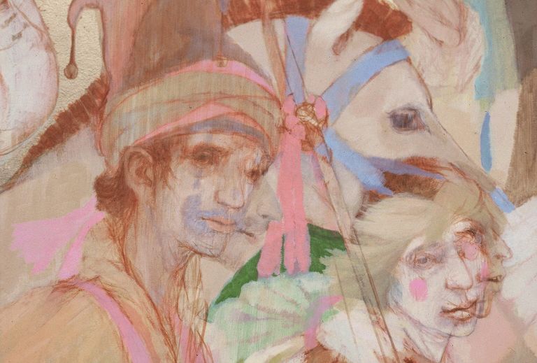 This is the little man that's leading the whole procession, seated on the donkey. Not quite so much of a Harlequin but his trousers sort of look that way.