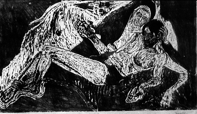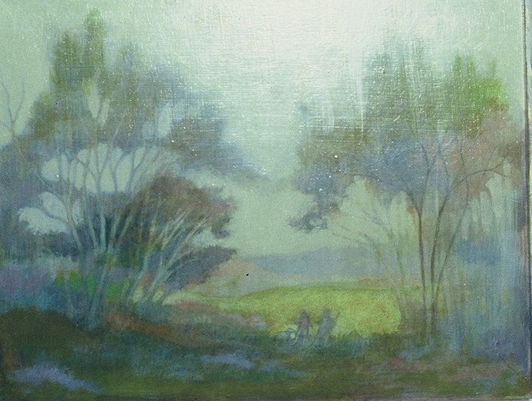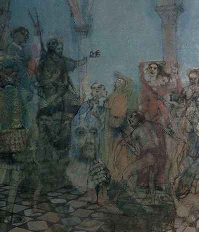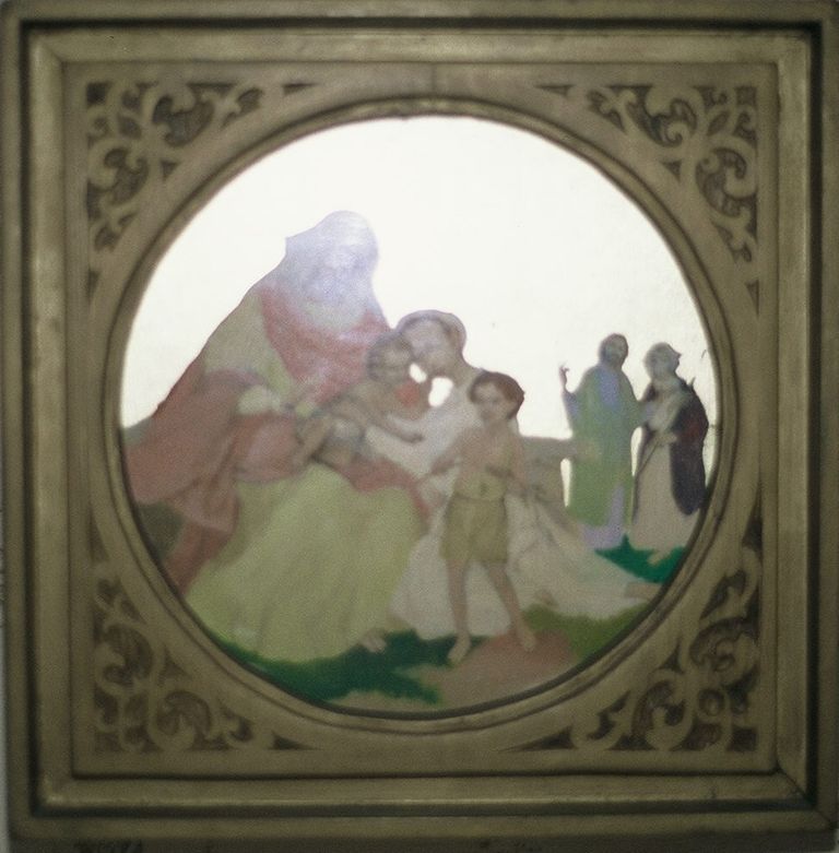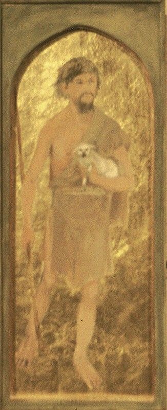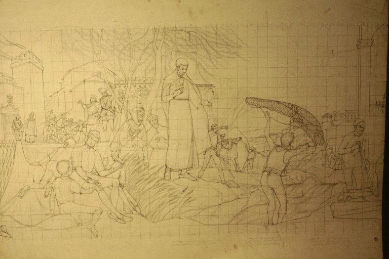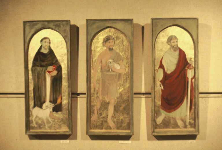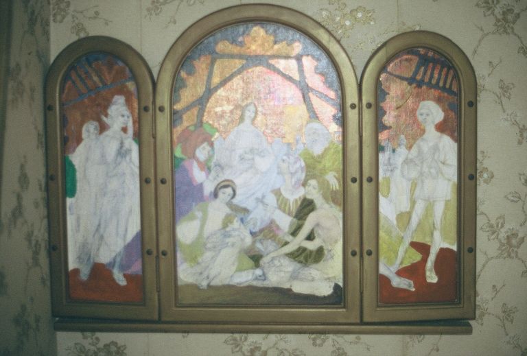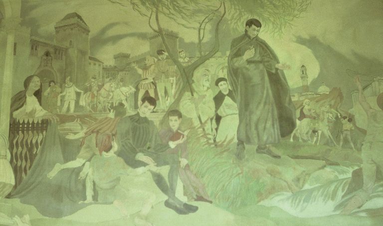 Bernard Riley was raised in a Catholic family and maintained that faith throughout his life. He created a series of Life of the Saints works, small single portraits many done with gold leaf background. The urge to paint on a grand scale was fulfilled in 1959 when he designed a detailed narrative mural recording the life of St. Aloysius Gonzaga for Fairfield University.