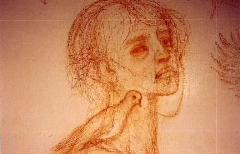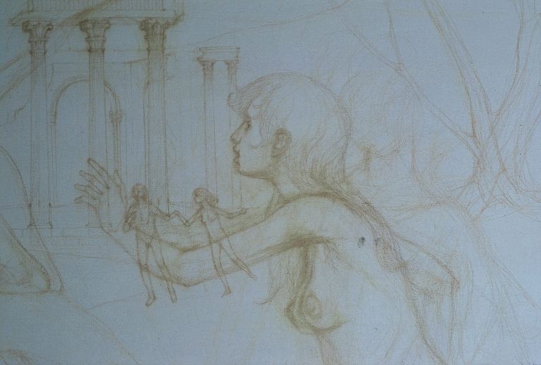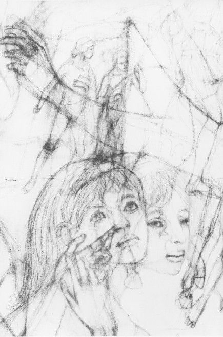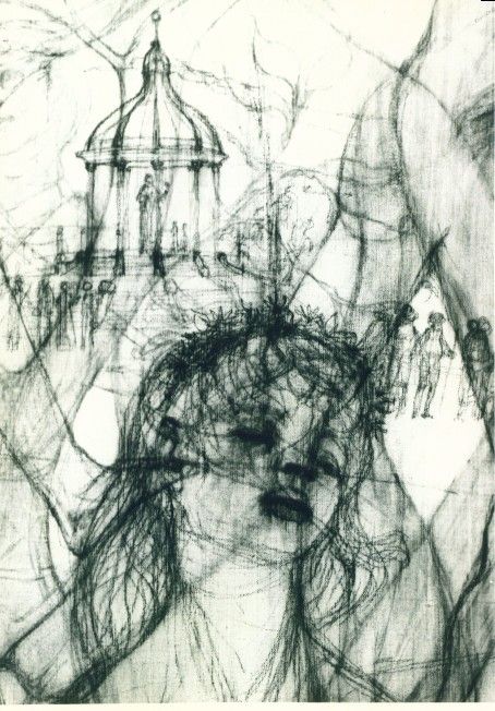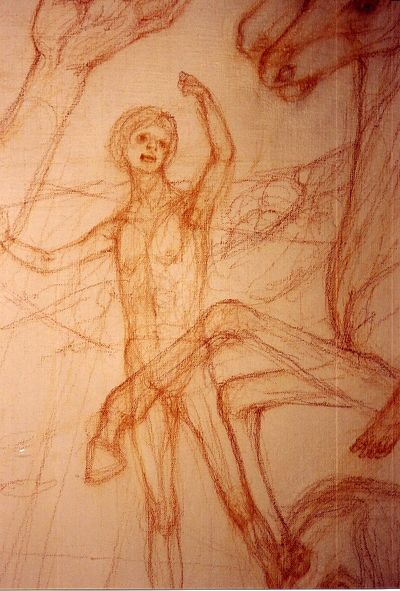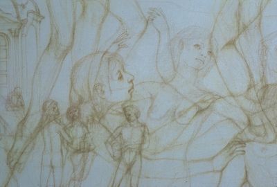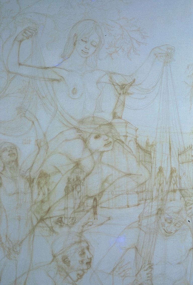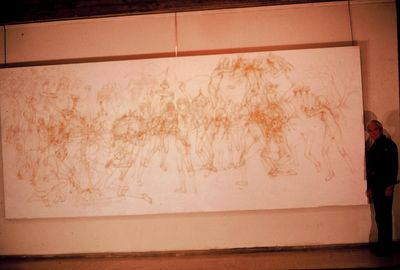 A 1975 exhibit at the Silvermine featured gigantic, floor-to-ceiling drawings done with a brush. The act of drawing on a wall surface with a brush using reddish sepia is a rather outdated art technique anchored in Renaissance tradition. It becomes symbolic of the story Riley tells about the rapid disappearance of manual craftsmanship. Its bringing something new into an era that people have lost understanding of to see someone actually doing a craft operation. They are seeing someone drawing on a wall, they wonder what can this be?